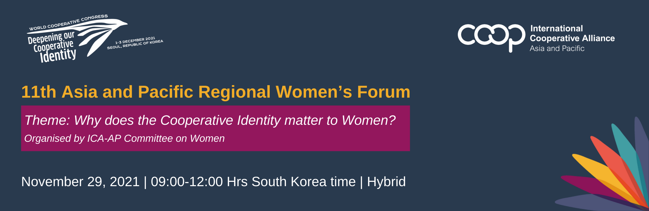 The 11th Asia and Pacific Regional Women’s Forum will be held in conjunction with the 33rd ICA Congress on Deepening the Cooperative Identity. It will serve as a timely platform to discuss why the Cooperative Identity matters to women. The identity of women cooperators is embedded within a wide range of social, economic, cultural, political, and religious contexts, which shape and influence their identity and position in society. The Cooperative Identity rooted in principles and values offer women the opportunity to organise themselves to realise their common economic, social and cultural needs irrespective of their diverse backgrounds and contexts.