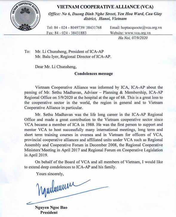 Vietnam cooperative Alliance was informed by ICA, ICA- AP about the passing of Mr. Sethu Madhavan- Advisor- Planning & Membership, ICA- AP regional Office on 5/9/2020 at the hospital at the age of 68.